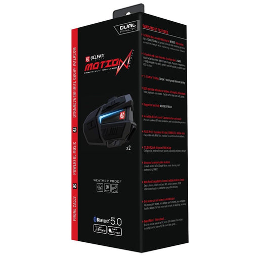 Ride smarter with the UCLEAR Motion Series, featuring DynaMESH intercom, crash sensor alerts, premium JBL-quality sound, and voice/gesture controls. Durable, weatherproof, and built for any helmet, these Bluetooth comm systems keep you connected with music, calls, and group intercom — wherever the road or trail takes you.