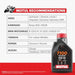 Motul 7100 4T 10W-40 Synthetic Oil 1 Liter (104091)Ester Core technology offers improved engine protection, performance and reduced oil consumptionExcellent for sport bikes, street bikes and off-road bikesLow sulfur and phosphorus formula for bikes fitted with catalytic convertersMeets the following standards: API SN and JASO MA2. Backwards compatible with API SM/SL/SJ/SH/SGProprietary extreme pressure formula to protect the gearboxEach bottle has a built-in pour spout to avoid spills